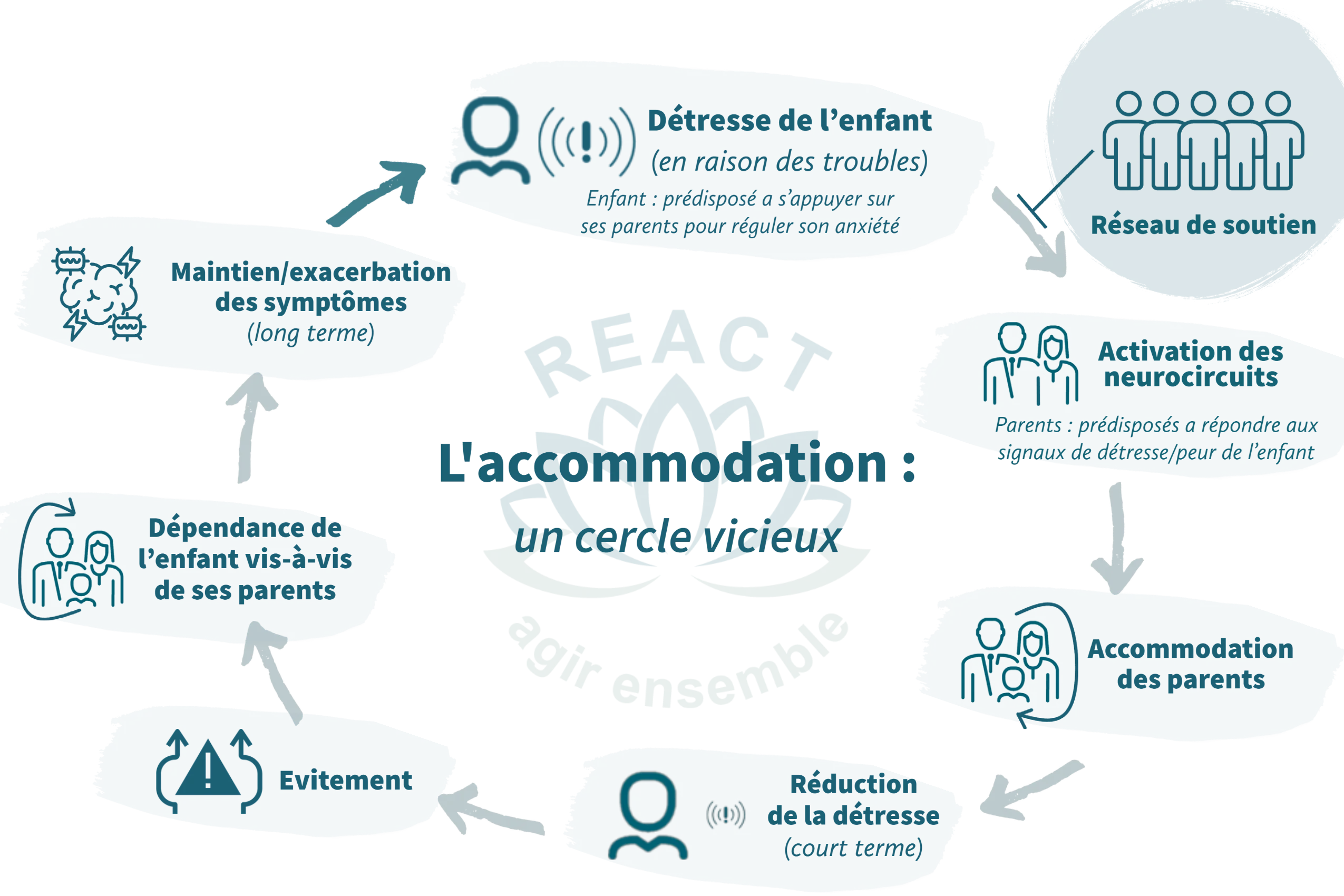 - A long terme, l’accommodation parentale contribue au maintien et à l’exacerbation des symptômes, augmentant la détresse de l’enfant et renforçant progressivement l’accommodation familiale4,5.